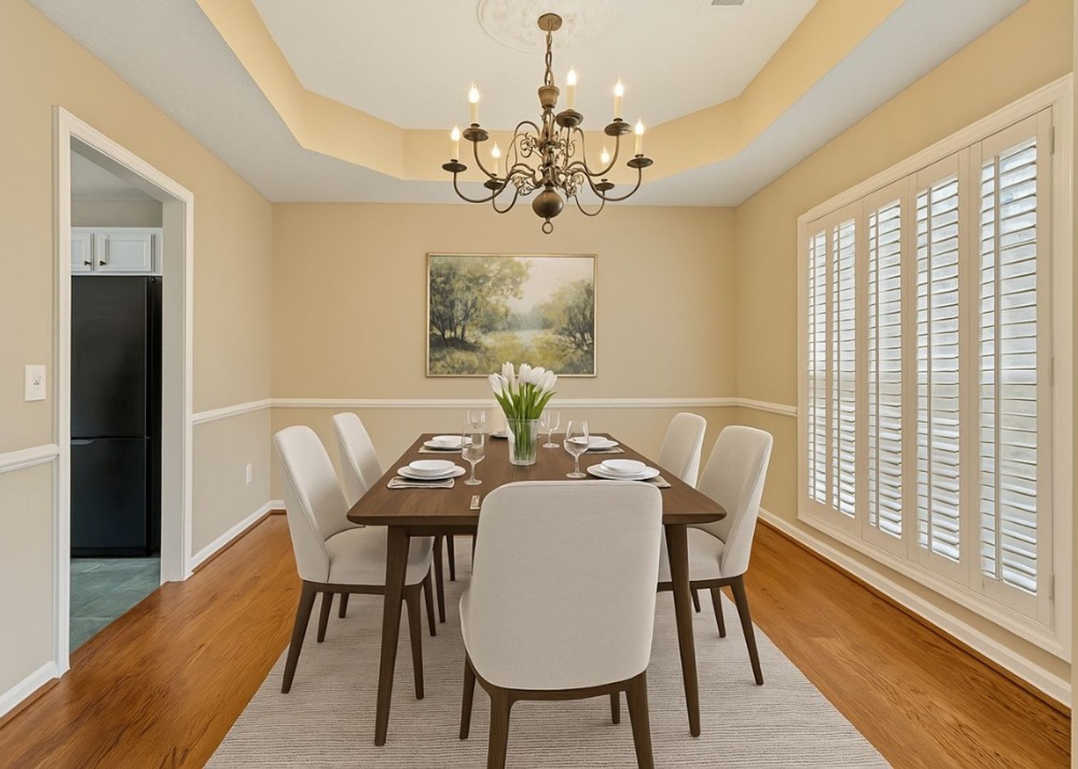 Great location close to Kroger, shopping, restaurants, & everyday essentials. Charming 3-Bedroom, 2-Bath one-level home. Enjoy a bright and welcoming interior featuring fresh paint, updated ceiling lights, & all hardwood flooring throughout. The spacious living room with vaulted ceiling includes a cozy gas fireplace. The kitchen has updated with granite countertops and has a breakfast room and a formal dining room. The primary bedroom features a tray ceiling, ceiling fan, a walk-in closet with new hardwood flooring, & an ensuite bathroom w/ a garden tub, separate shower, & double vanity. The newly painted garage, 414 SQFT, is heated & cooled & has a ceiling fan—ideal for a gym, or flex space. The property also has a fenced backyard!